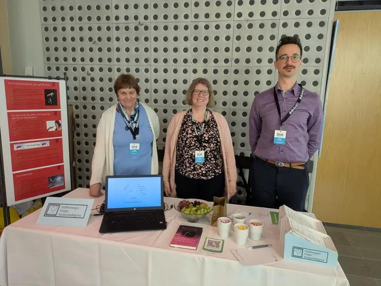 Stödföreningen på BUS-dagarna 2023 i Eskilstuna. Violet, Jane och Mats representerade Stödföreningen Stoppa Romansbedrägerier under BUS-dagarna (Budget- och skuldrådgivare) som ägde rum i Eskilstuna 26-27 april 2023, som de upplevde som mycket lyckad. Mats som är ny medlem i föreningen hade hjälpt till att fixa riktigt snygga utställningsskärmar. Många män som var på plats ville prata med Mats och föreningen knöt flera nya värdefulla kontakter. Flera aktörer, både från offentlig sektor och privat, utryckte ett intresse av att bjuda in oss att hålla föreläsningar om romansbedrägerier, främst i Göteborgsregionen och i Skåne. På den ena bilden syns vår utställningsskärm med information och den andra bilden med en Sverigekarta innehåller nålar där vi markerat ut alla de platser i landet där det finns någon som blivit utsatt för ett romansbedrägeri och som varit i kontakt med vår förening.